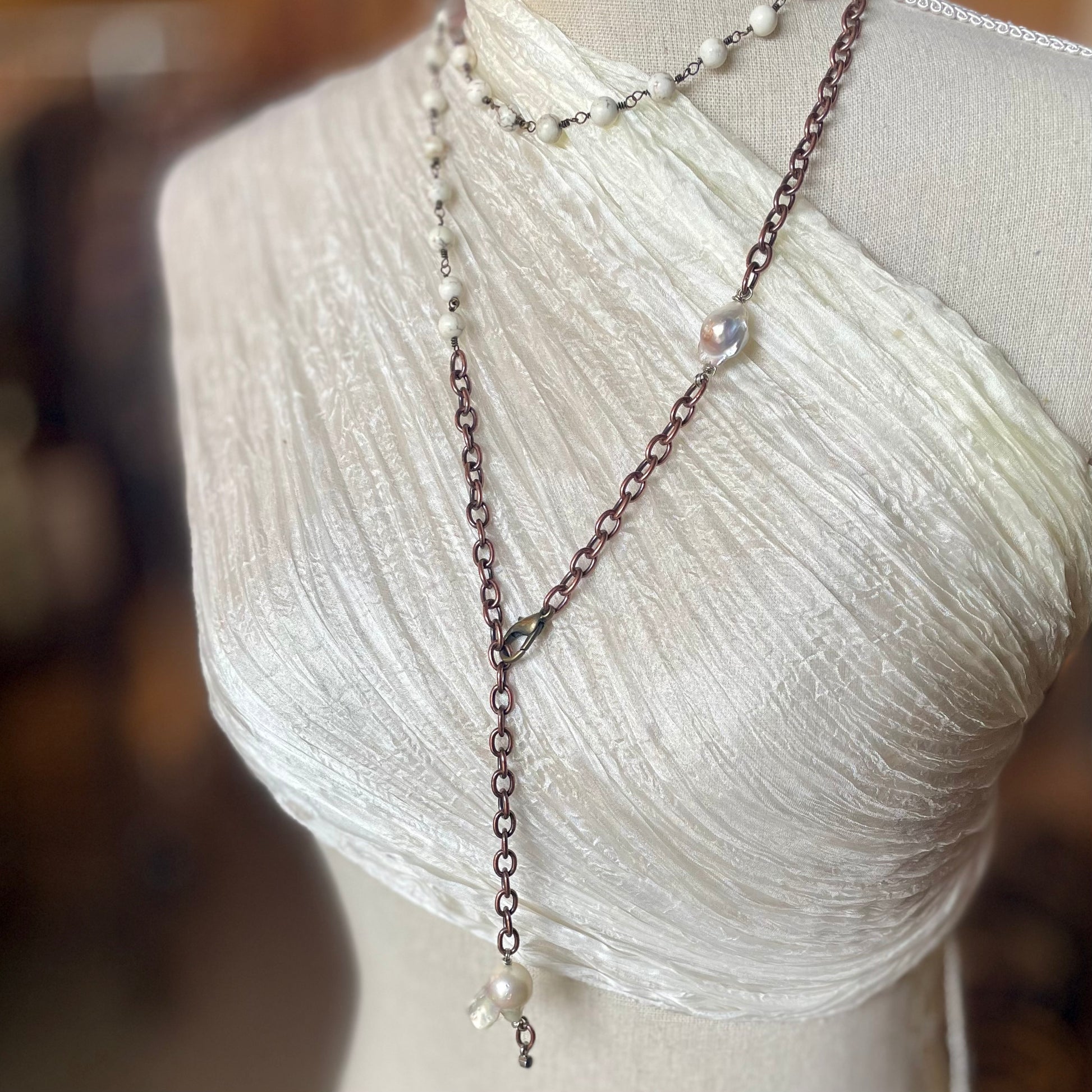 The Julia Necklace, Amy Louise Jewelry custom design, a handmade design featuring fresh water pearls and howlite beads. A versatile necklace that can be wrapped for different lengths.