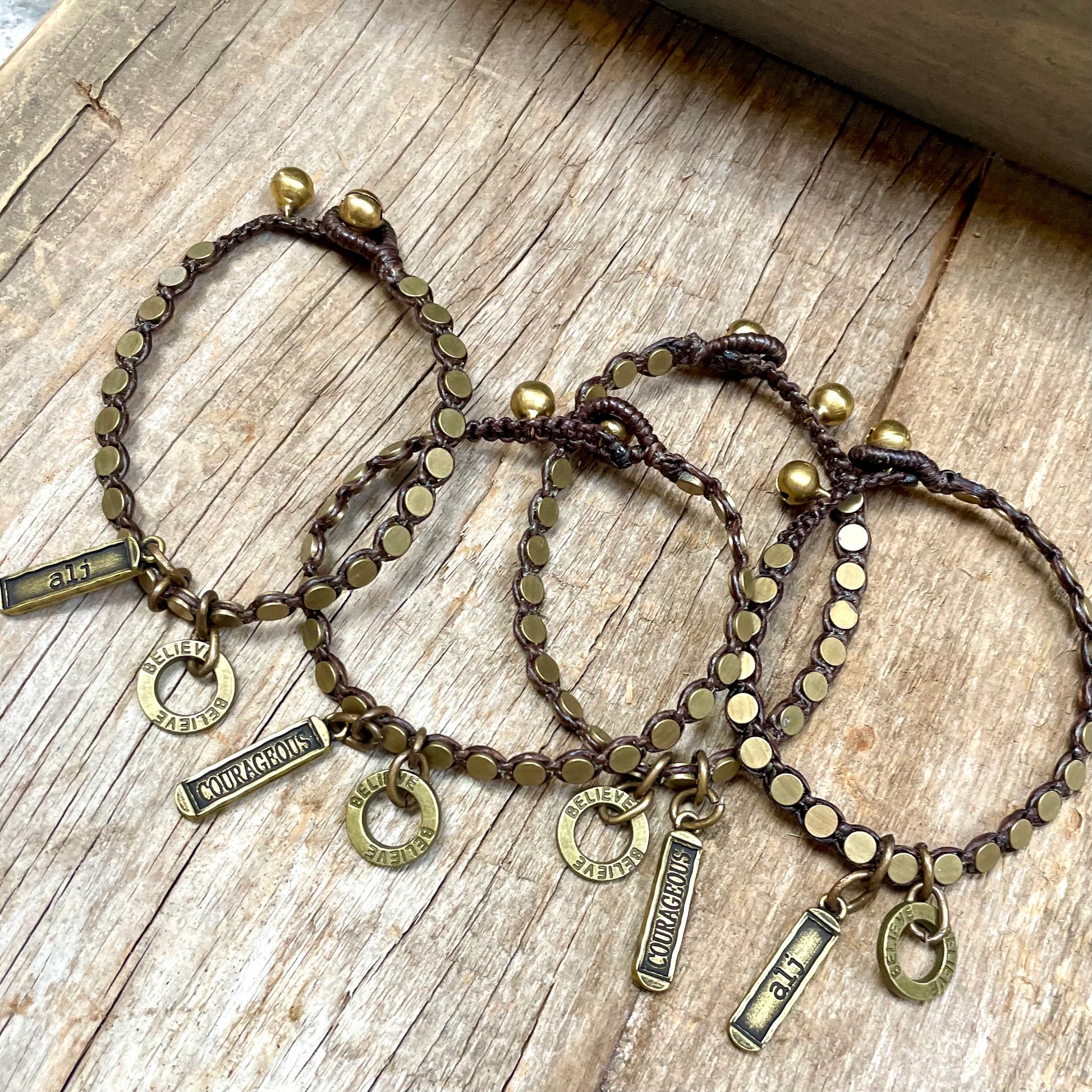 - The Lynn bracelet, created by Amy Louise Jewelry, features twisted leather with brass disks, and charms with statement believe and courageous. A brass bell adjustable closure.