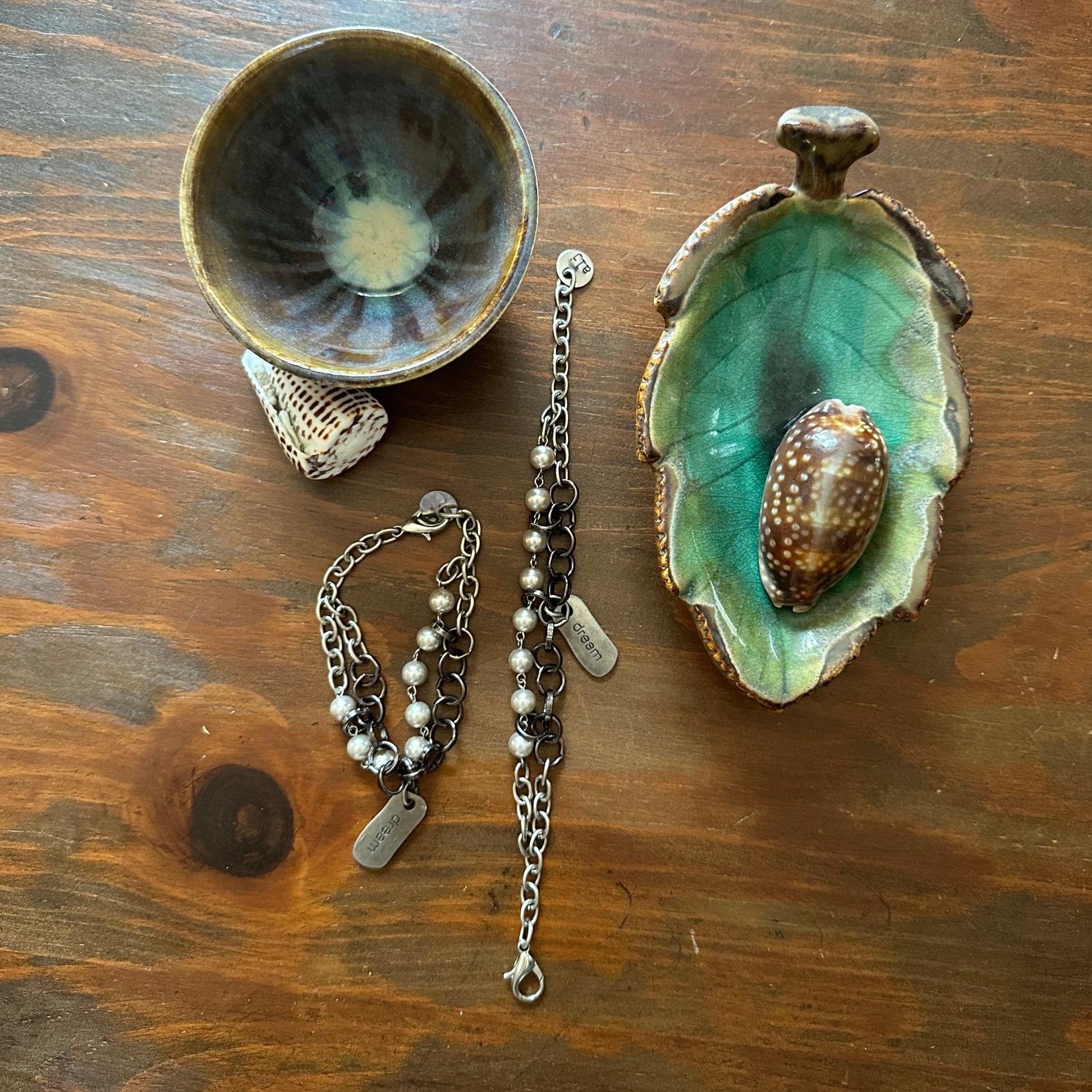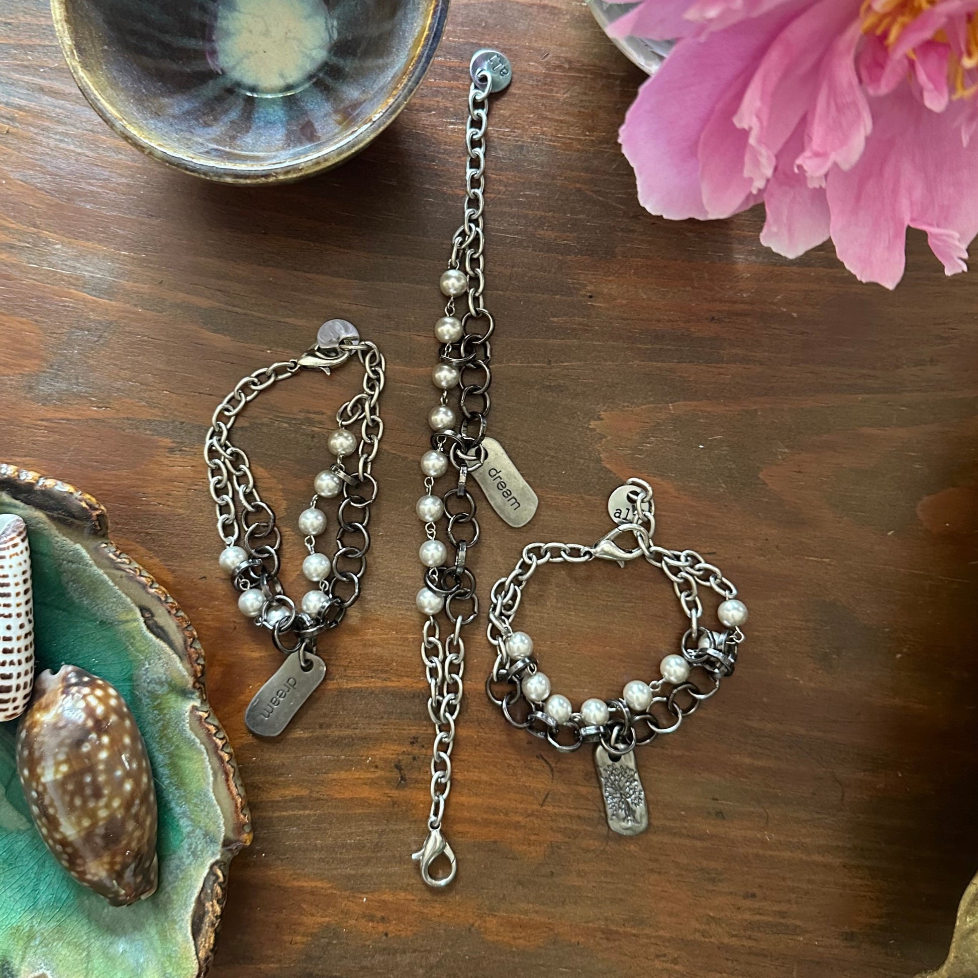 The Kennedy design embodies the signature Amy Louise style, featuring layers of chain and pearl that delicately convey the message to "Dream." This charming design exudes elegance and is sure to inspire anyone who wears it.
