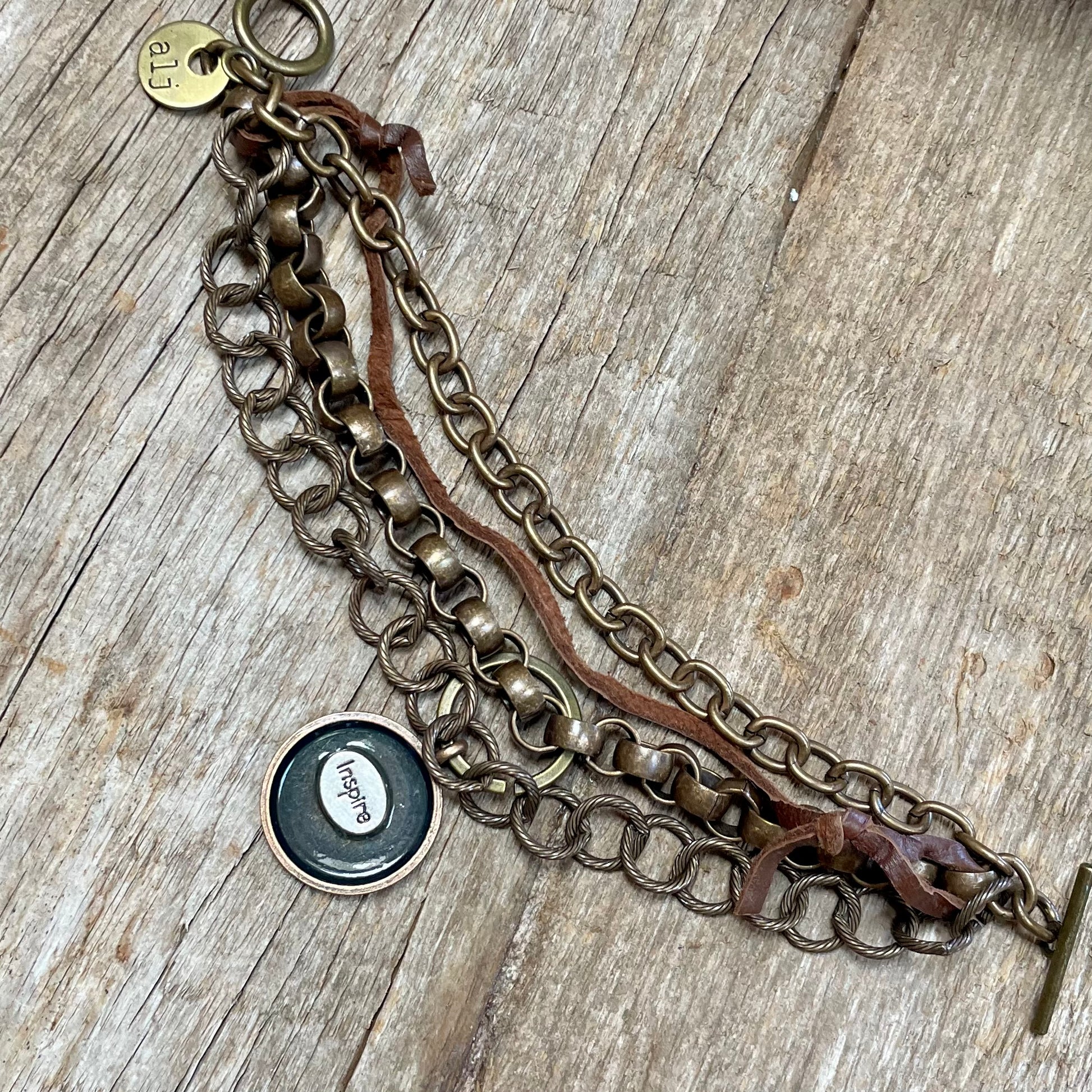 The Quinn Bracelet by Amy Louise Jewelry layers multiple brass chains for a look that’s both bold and feminine. A classic toggle clasp adds vintage charm, while a 1" circular brass bezel holds a statement word charm — choose between Create or Inspire to wear your daily mantra close to you.