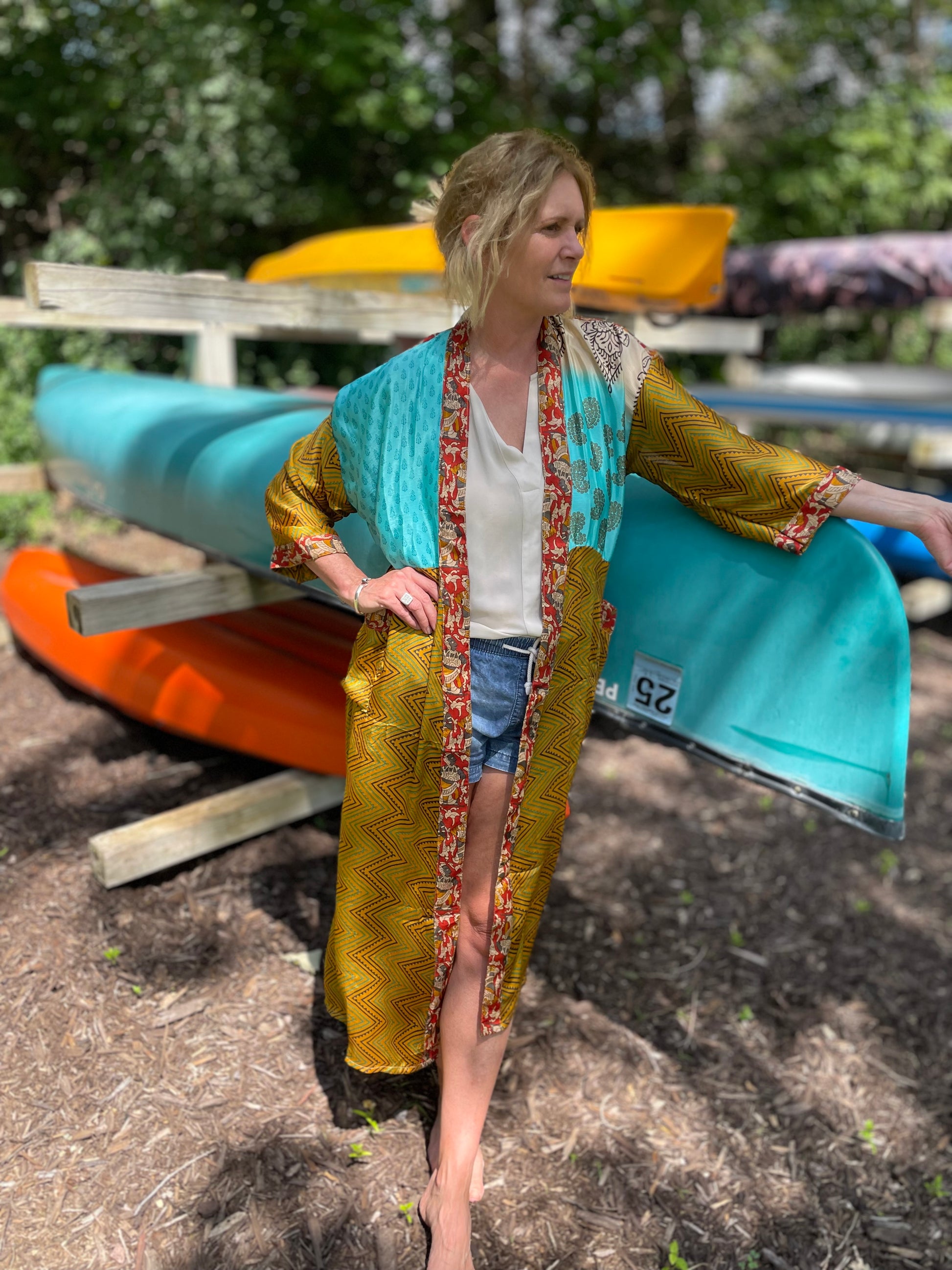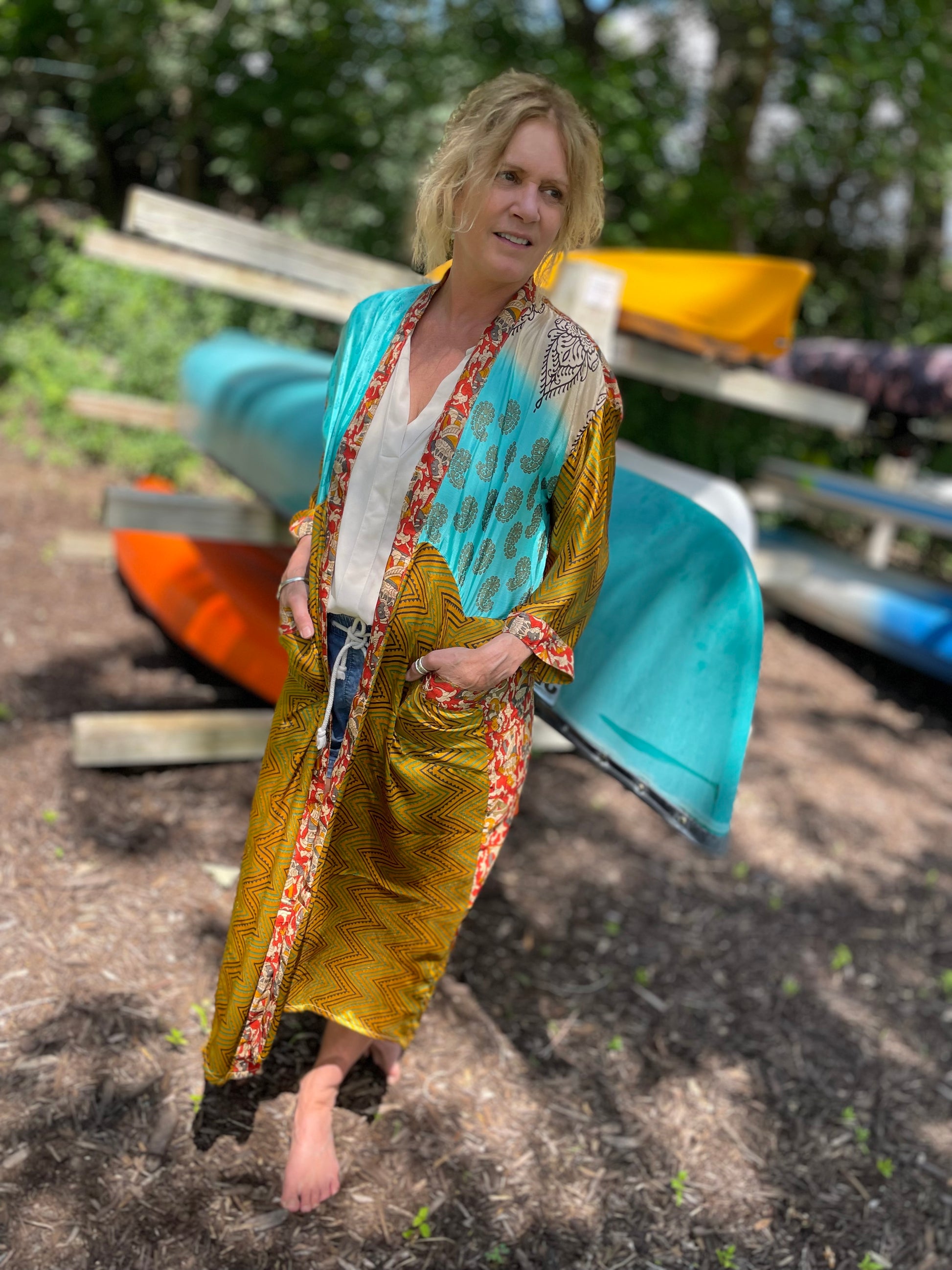 Luxe silk robe, shapeless silhouette with a belted waist. Each robe is individually created giving them a unique and one-of-a-kind look.
