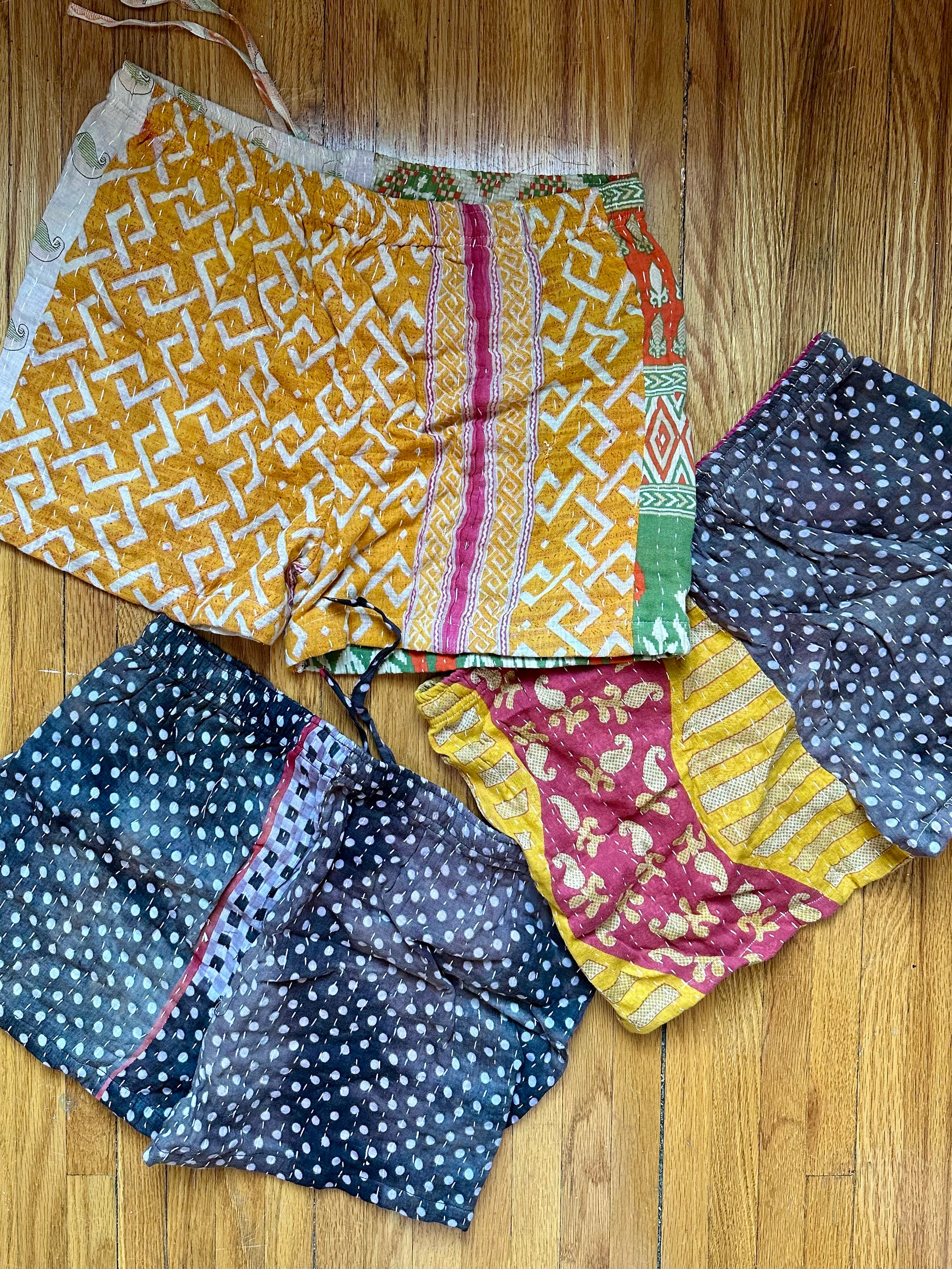 Bright and fun Kantha shorts for women, available in size medium and featuring a multi-color palette.