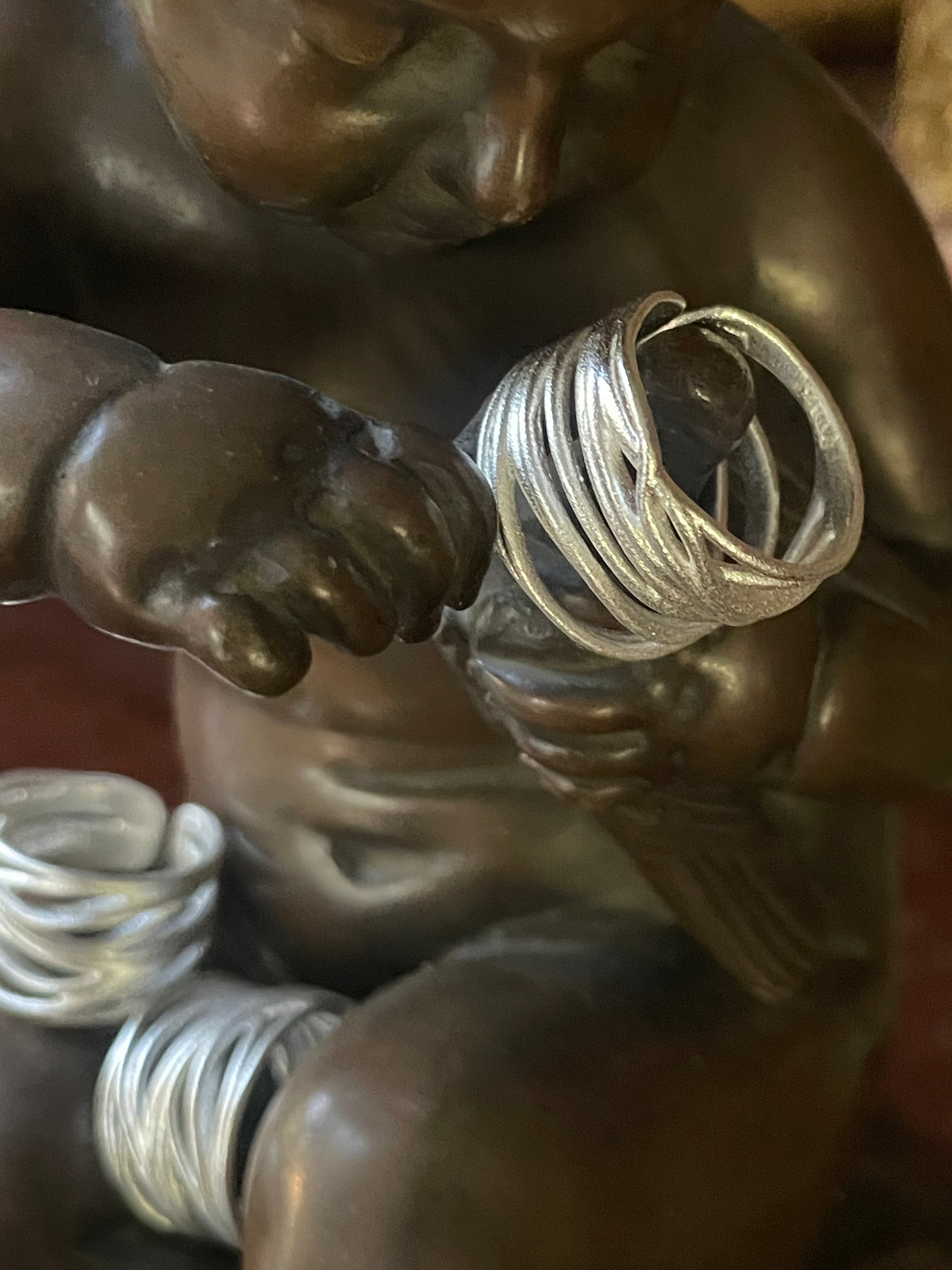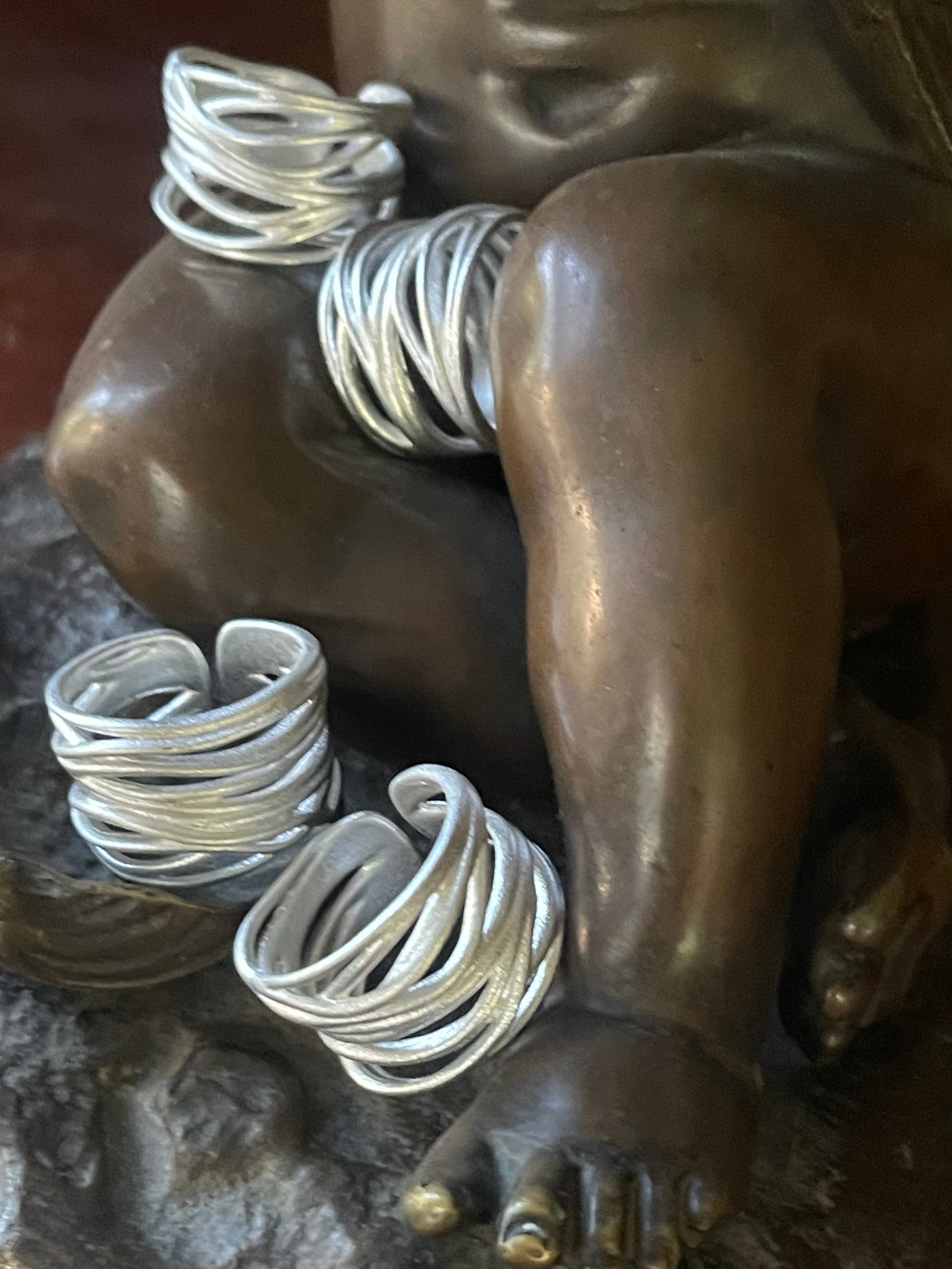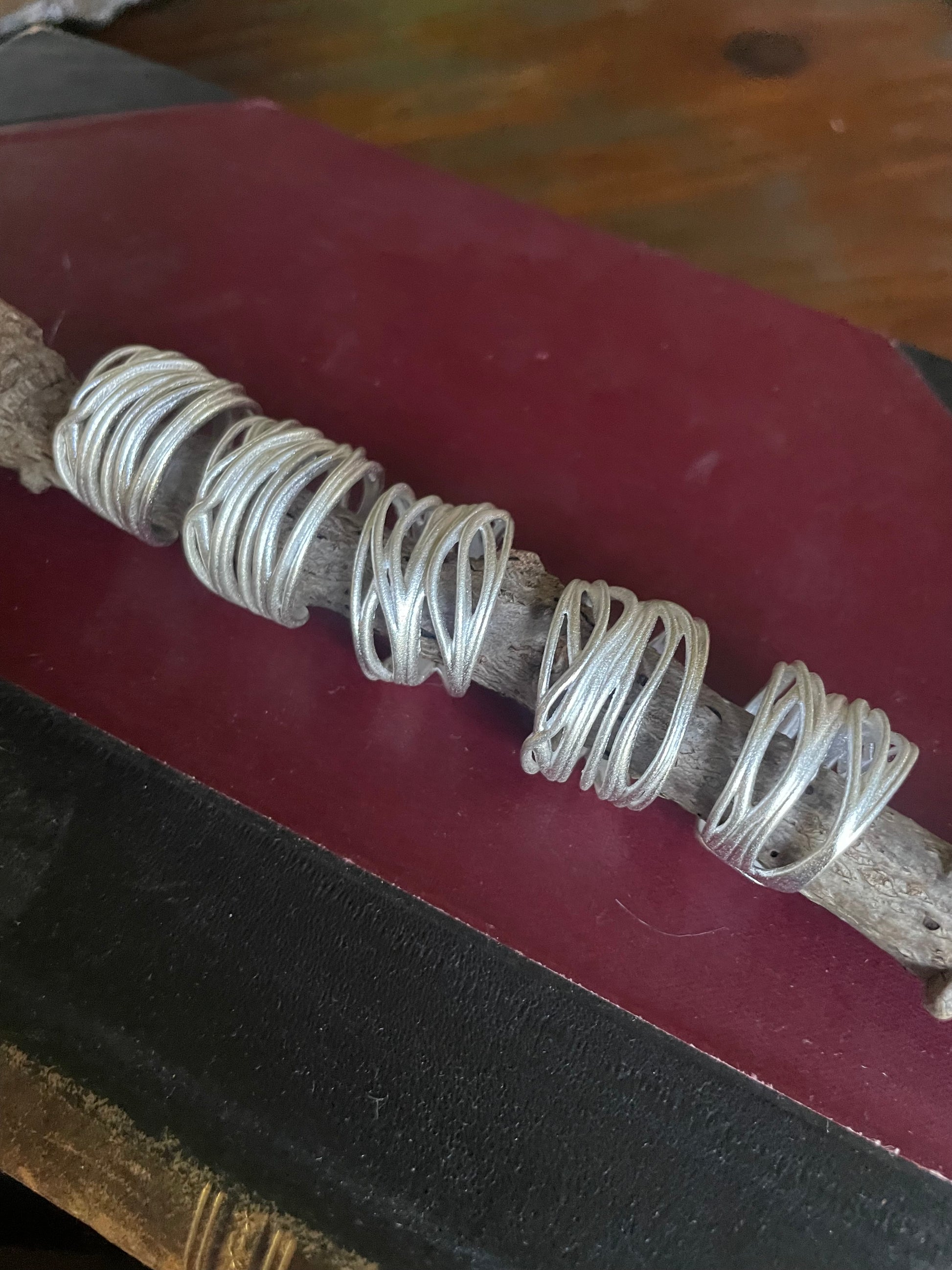 In this wraparound ring, silver coils around the finger as randomly as a vine around a tree.