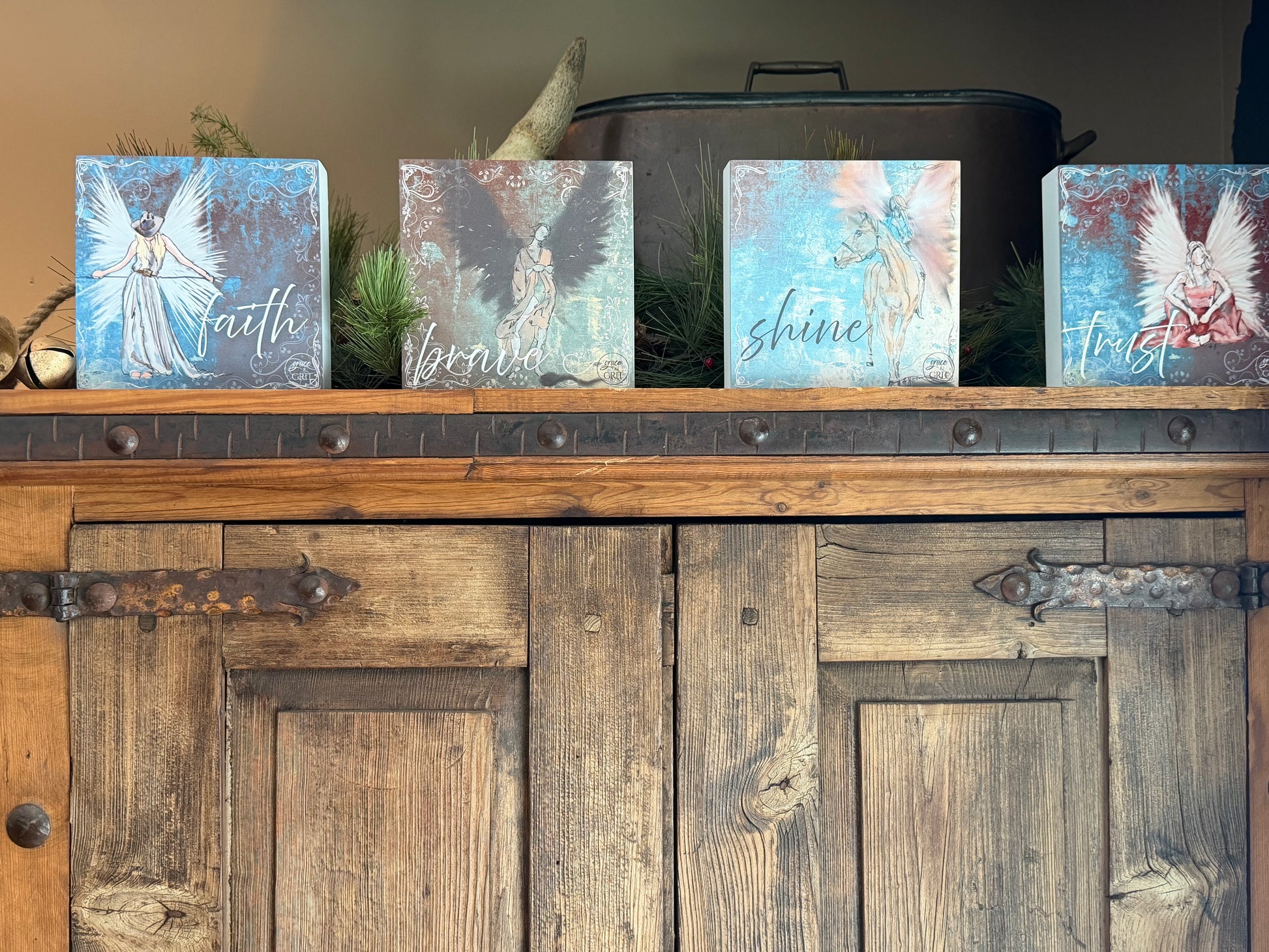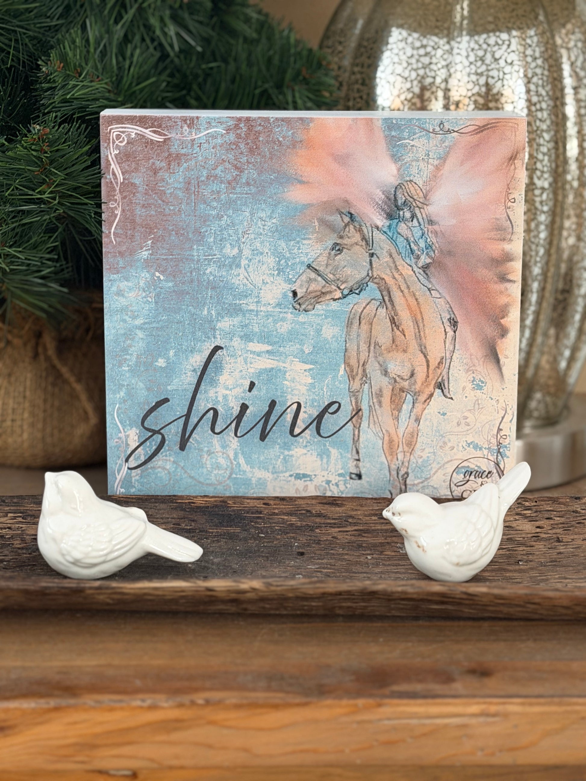 Meet Shine — a soulful 7x7 wood art sign designed to bring a tender glow into any room. Featuring an angel seated on a horse, looking softly into the distance, this piece blends dreamy blues, warm cream, blush pinks, and soft tan tones.