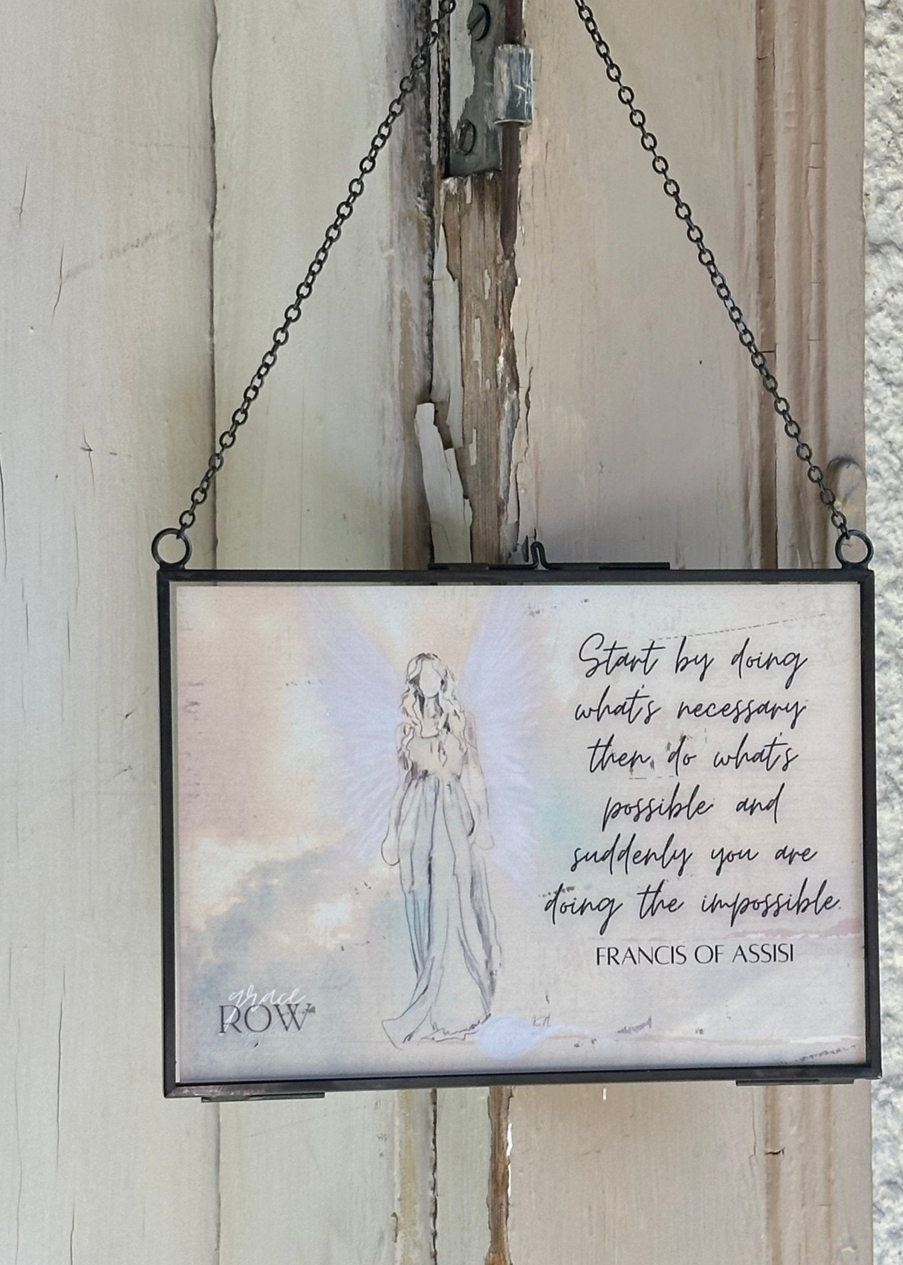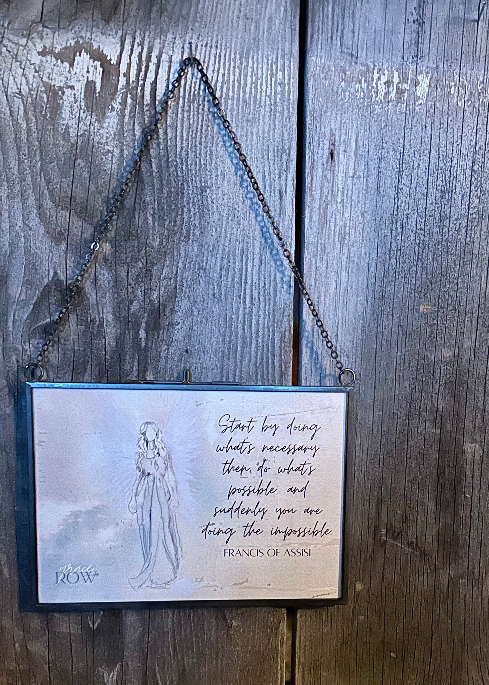 5" x 7" floating glass frame with chain to hang.