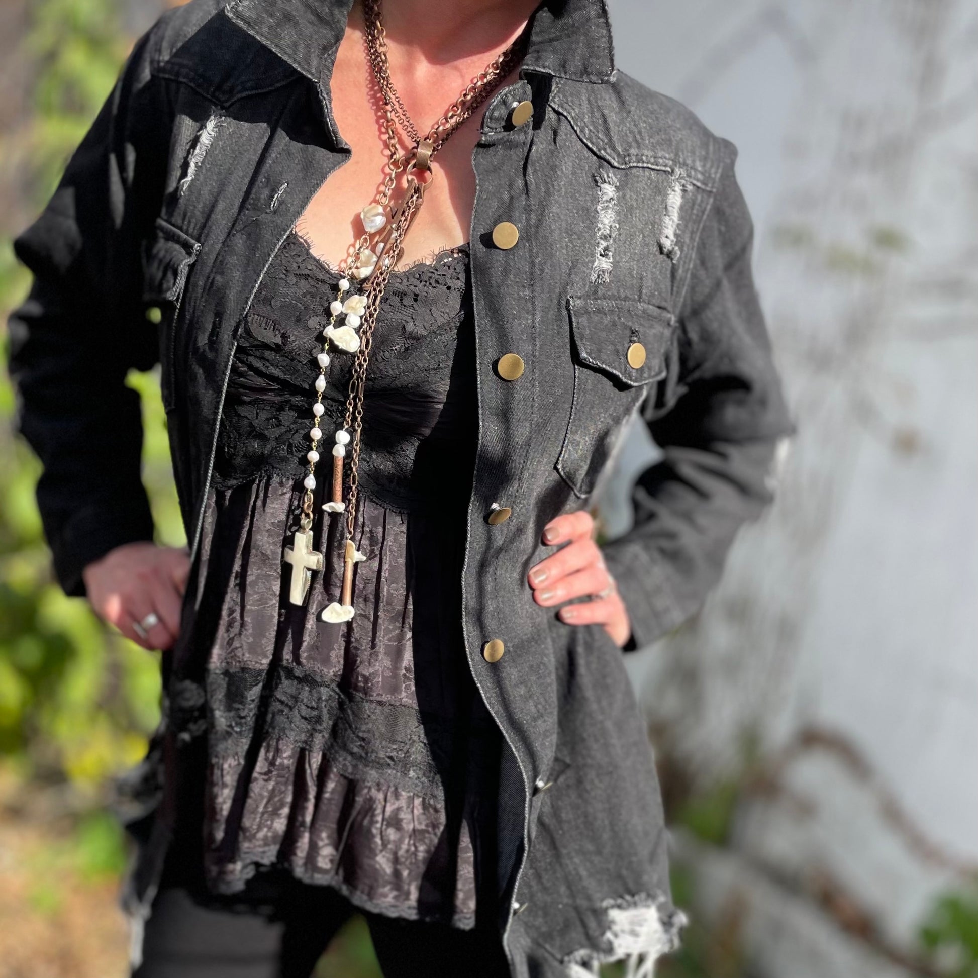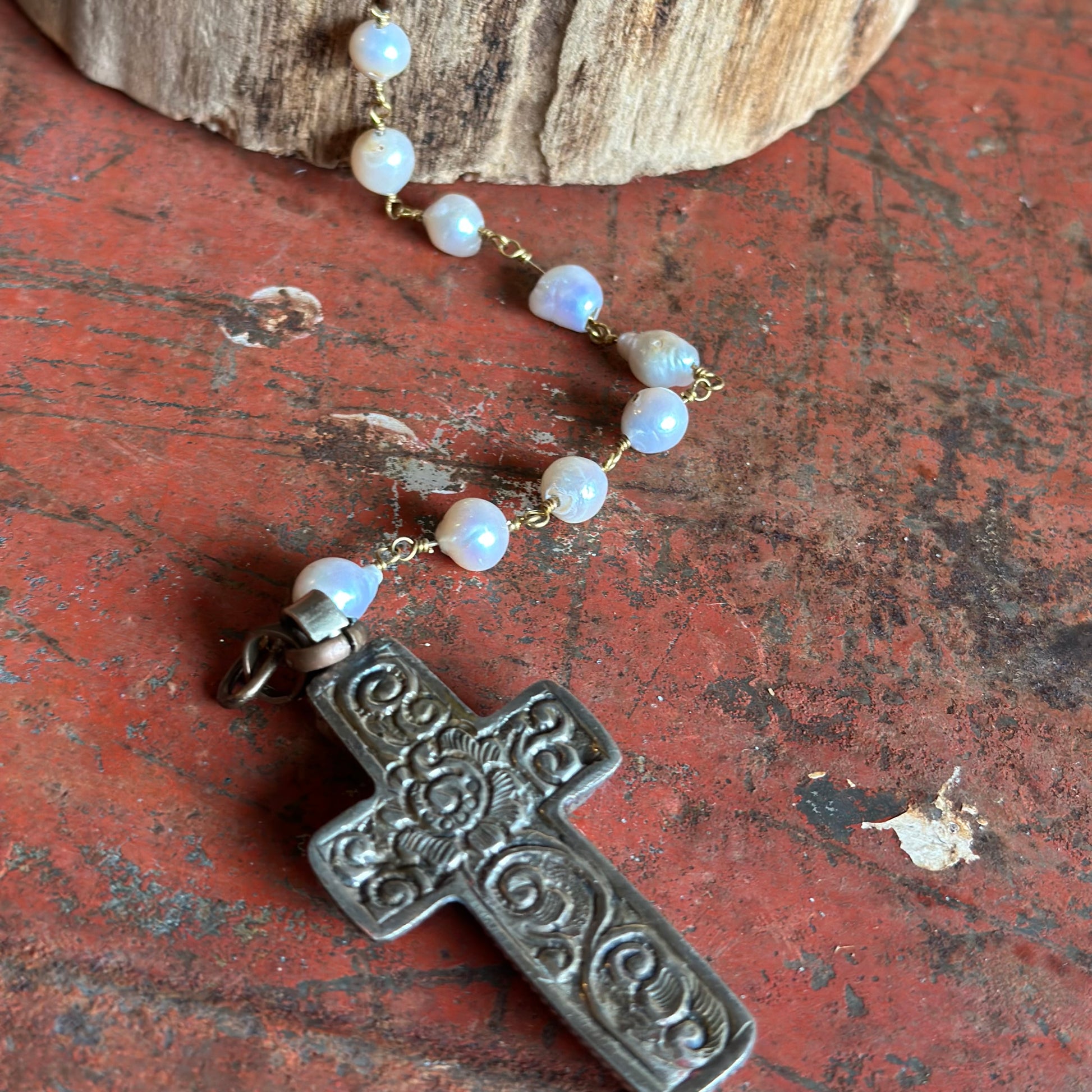 The Kacey Amy Louise Jewelry custom design, a handmade design featuring a wire wrapped pearl, pearl rosary chain and solder set cross pendant. Adjustable copper rolo chain holds the gorgeous drop beautifully around your neck. mocha pearl rosary and brass chain accent. Bling and large brass link accent. This design is versatile and lovely with any outfit.