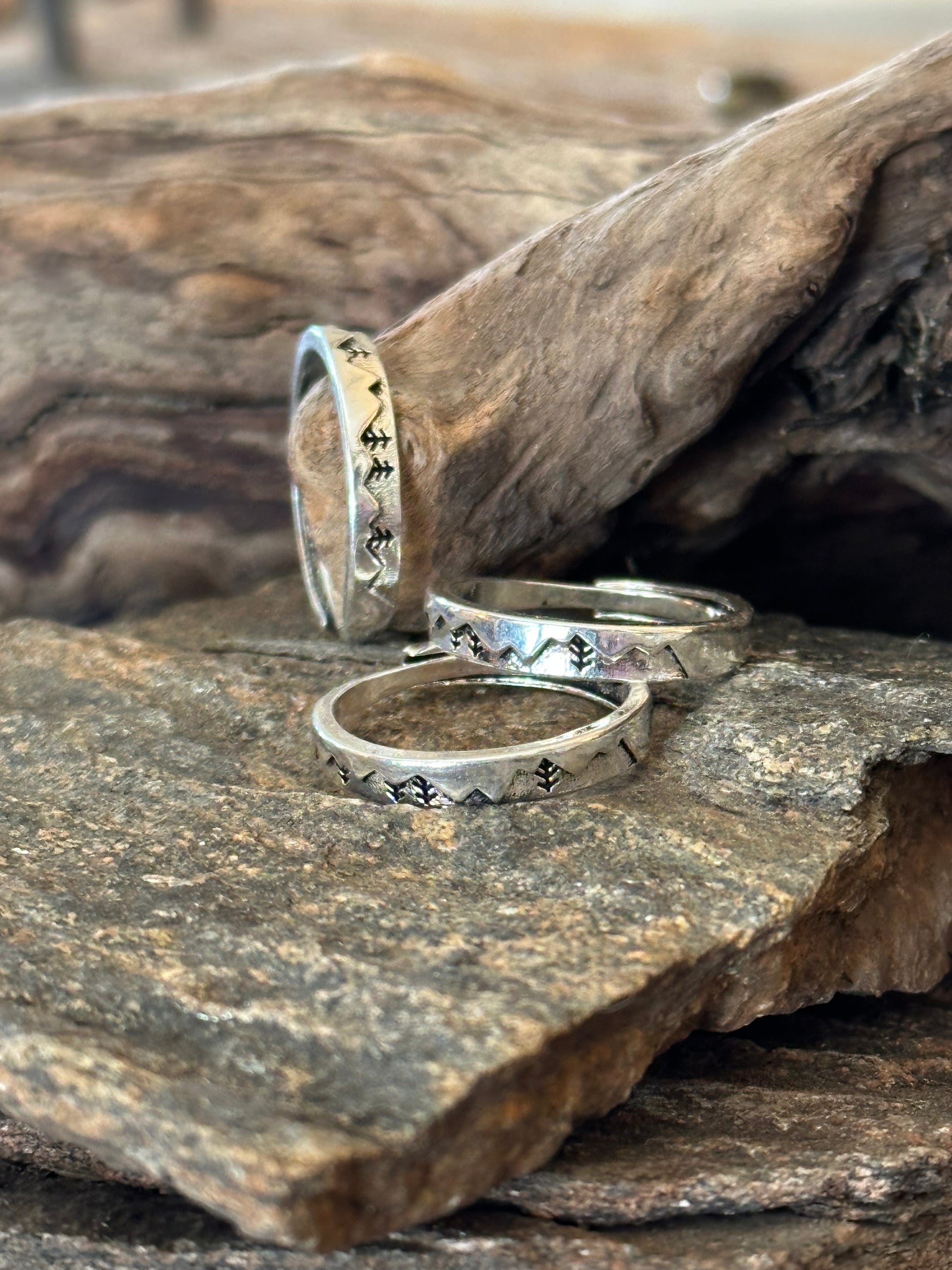 The mountain range symbolizes the ups and downs of life, reminding us that we can overcome any obstacle. Each moment we experience shapes who we are and holds great value. The mountains and nature keep us grounded in the reality of life, highlighting the importance of balance and harmony. This exquisite piece of jewelry is designed to be stacked with multiple rings, making it a beautiful and meaningful addition to your collection.n.