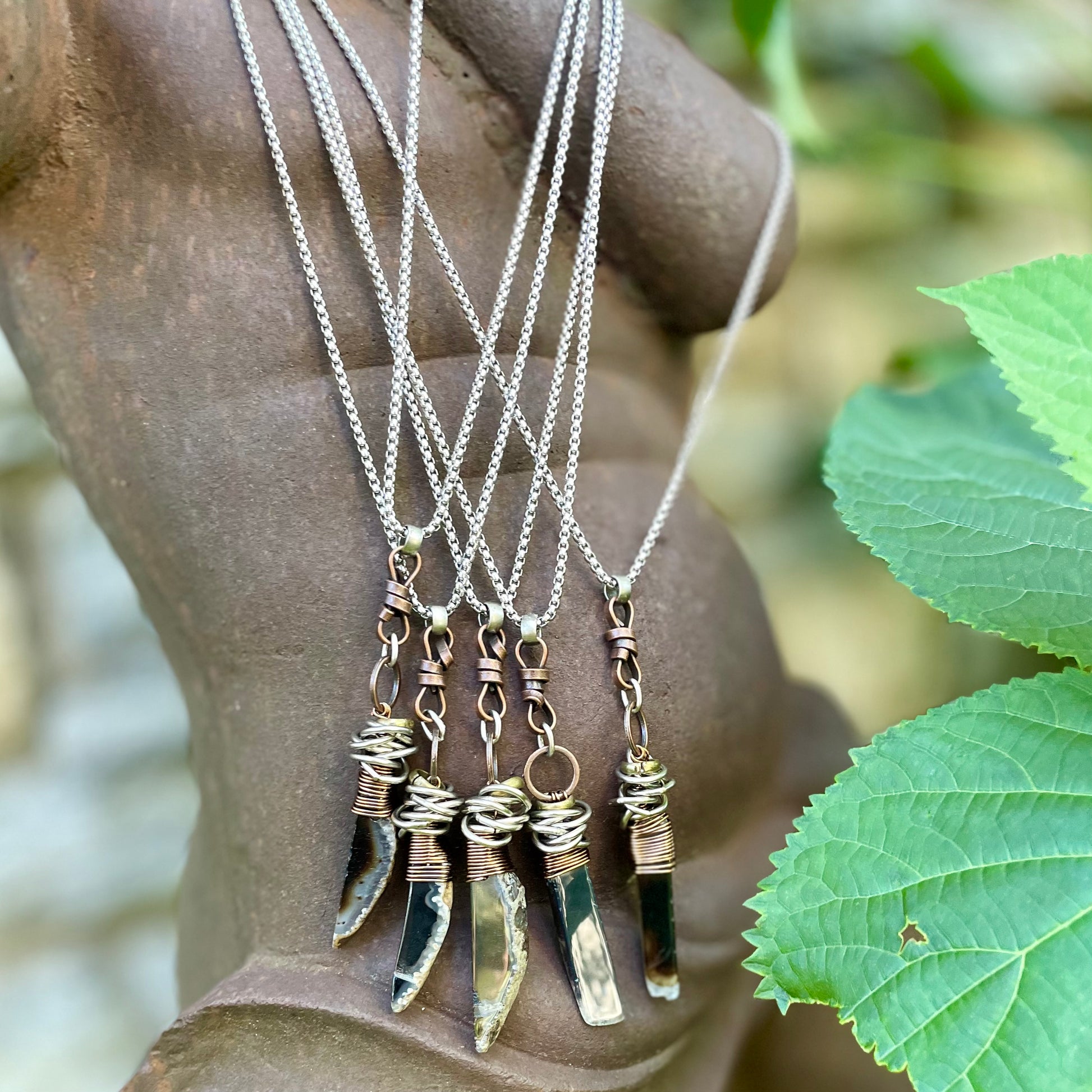 This handcrafted necklace features a beautifully rough cut black agate pendant, wrapped by hand and displayed on a stainless steel silver box chain. The perfect combination of style and durability for everyday wear.