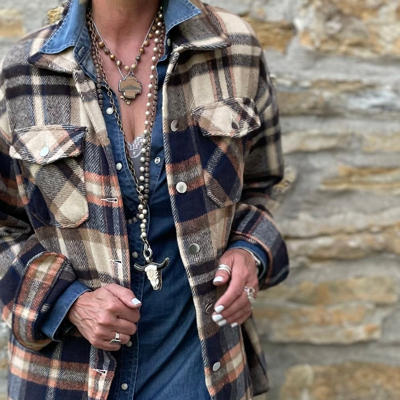 Teton natural stone rosary chain necklace with stunning pendant accent. Our Teton necklace is a statement piece. The rosary beads drape around this strand with color and style. Includes solder set stone pendant.