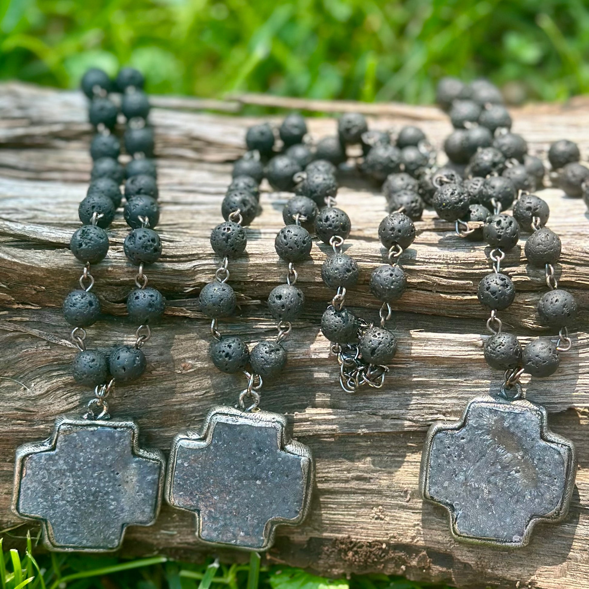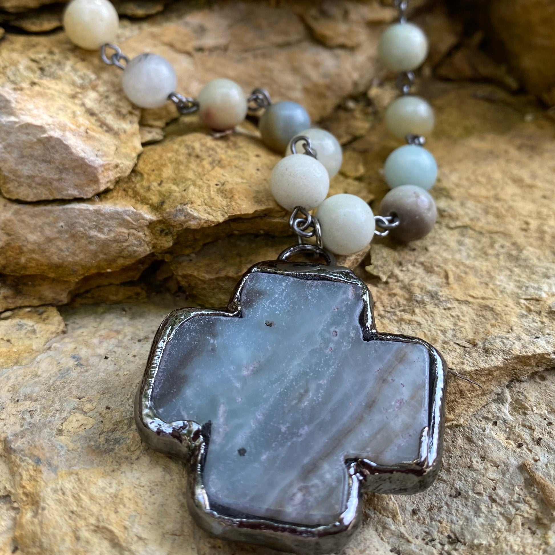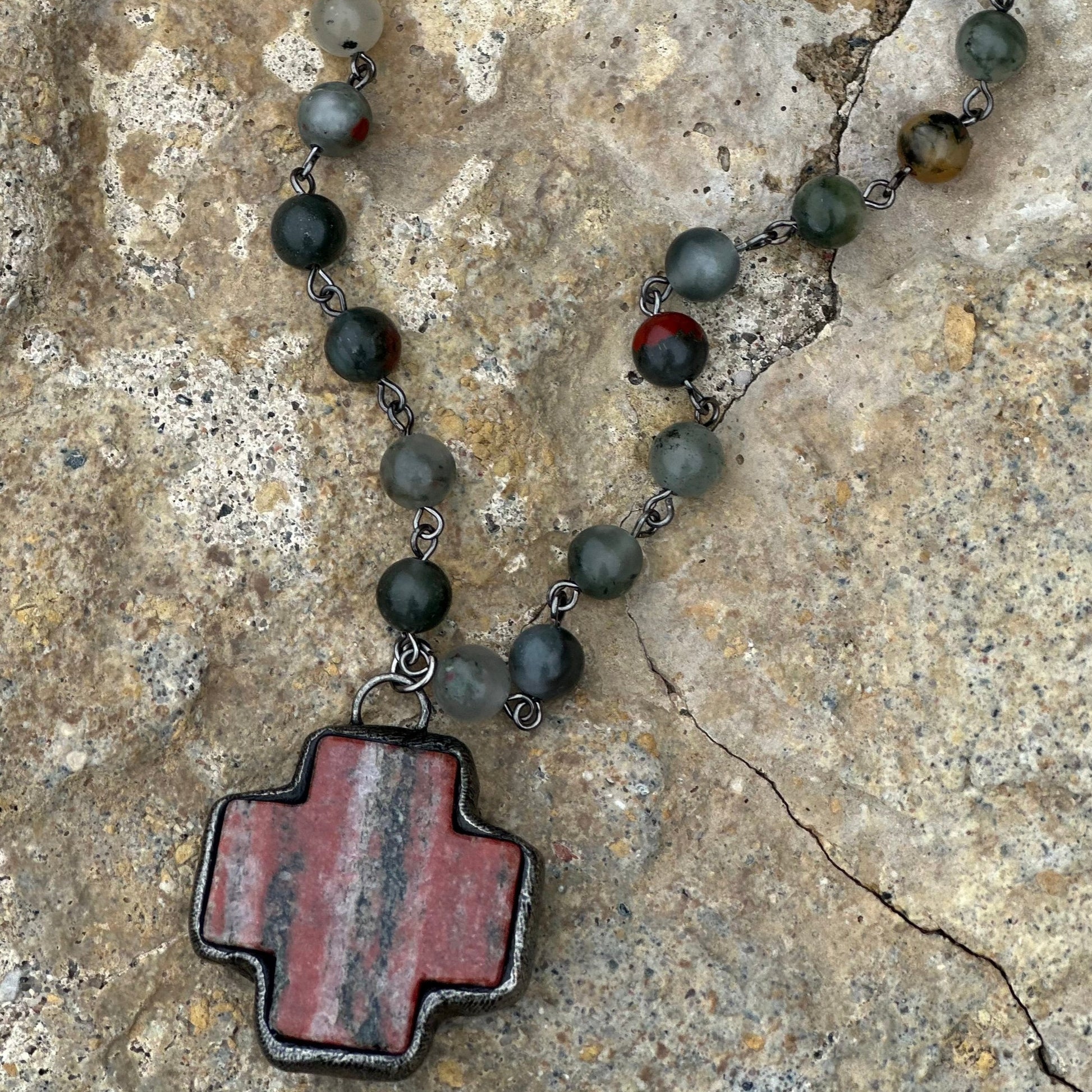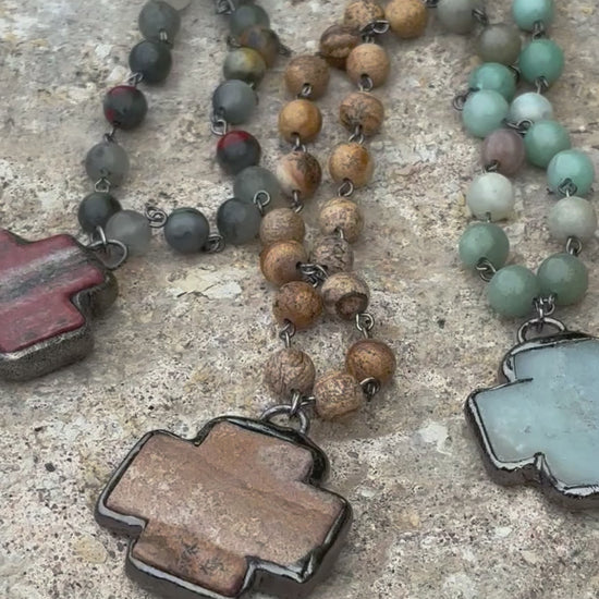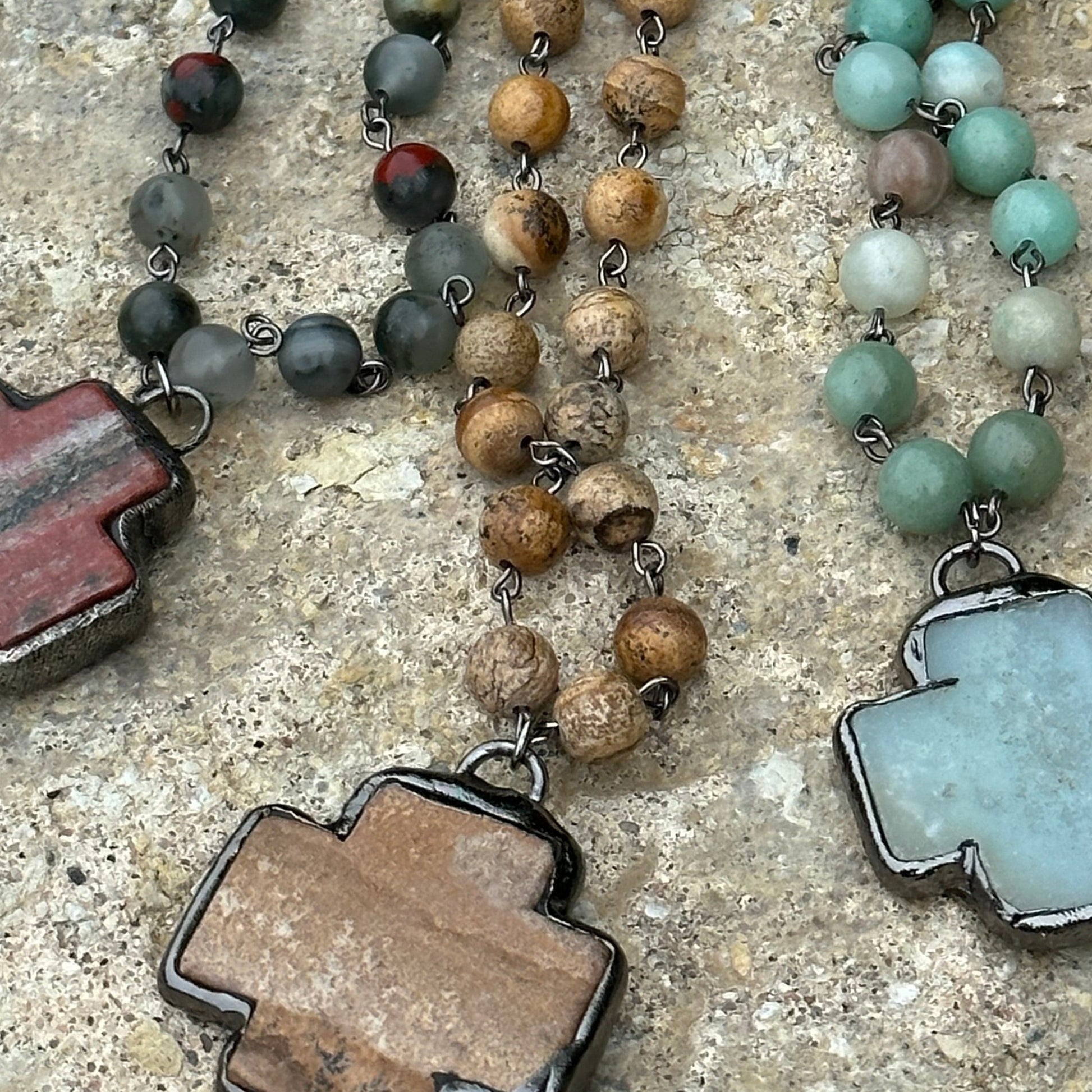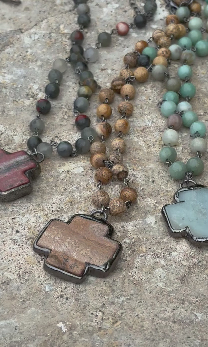 Color/stone options are sunset red, tan picture jasper and turquoise amonozite. Silver lobster clap and extender chain. 16"-17-1/2"l. Beautiful solder set stone cross design attached to natural stone rosary chain with a lobster closure. Pendant 2.5’ chain length 18”.