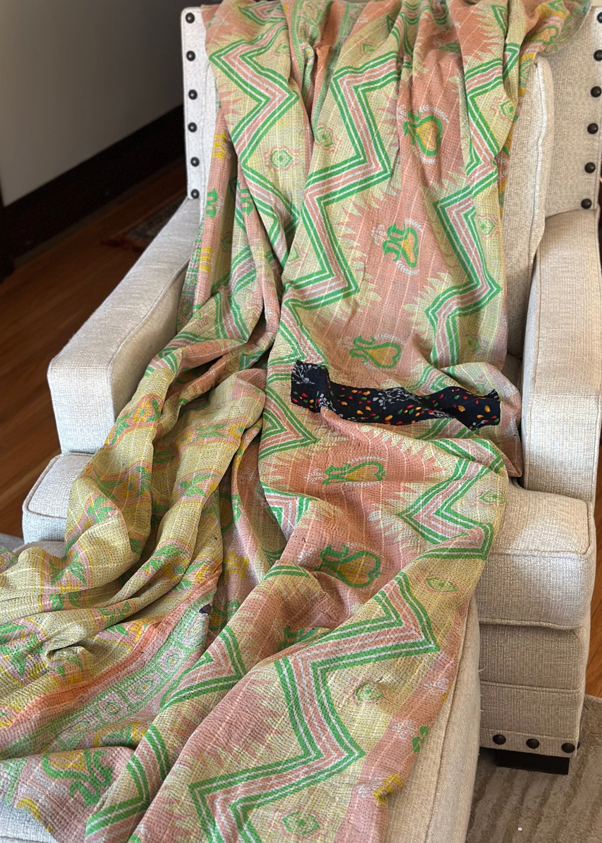 These Kantha quilts are hand-stitched from recycled sari cloth sourced from India. "Kantha" refers to the type of stitch that creates the quilts' distinctive wavy texture. In rural India, Kantha quilts are often offered to guests as seating, a place to rest tea, or simply as a gesture of welcome into the home. Each vintage Kantha quilt is unique, with imperfections and wear that contribute to its individuality. The artisans' skills in reviving and recycling these imperfections turn each piece into a one-of-a-kind collector's item. These quilts are reversible, showcasing two completely different designs.